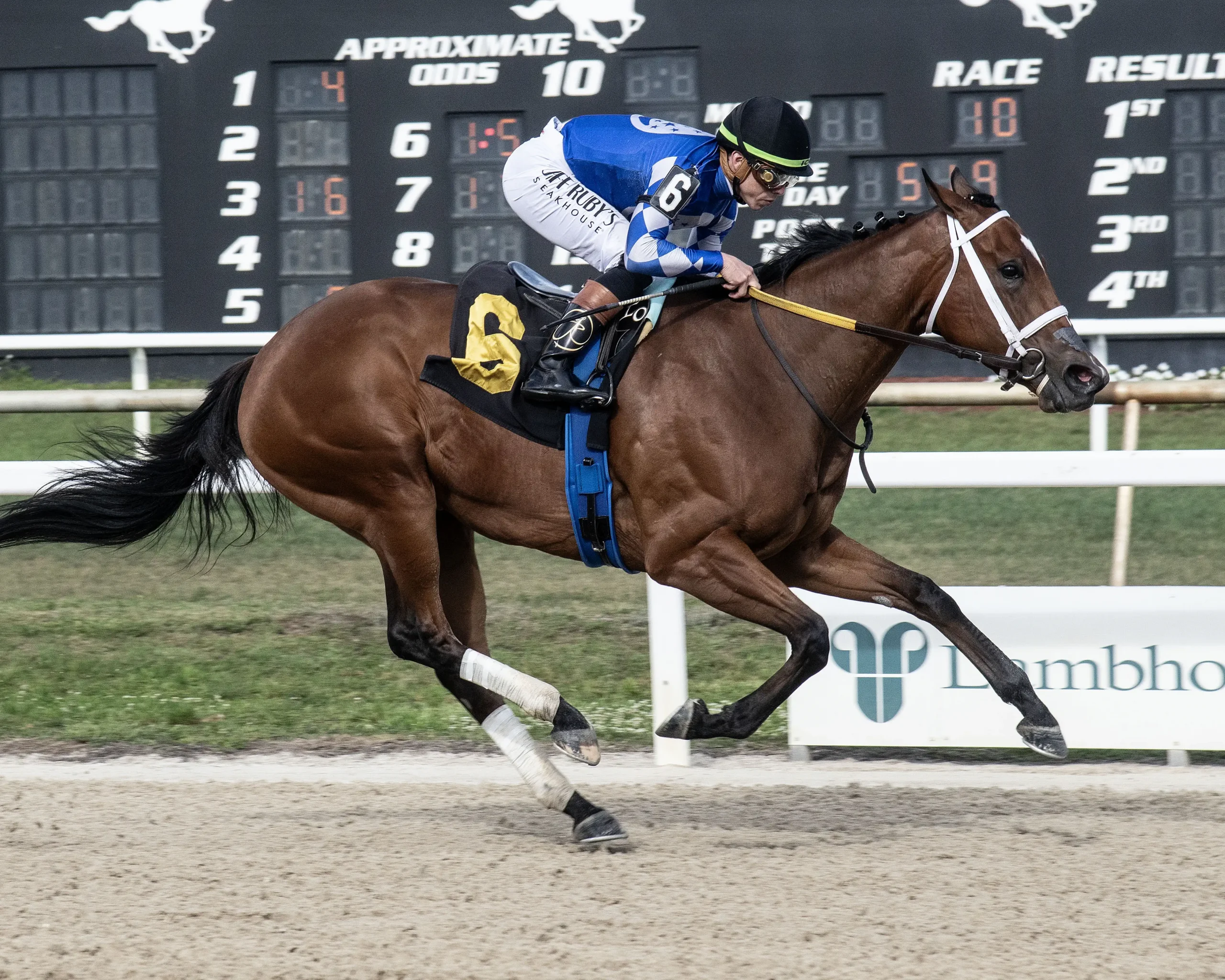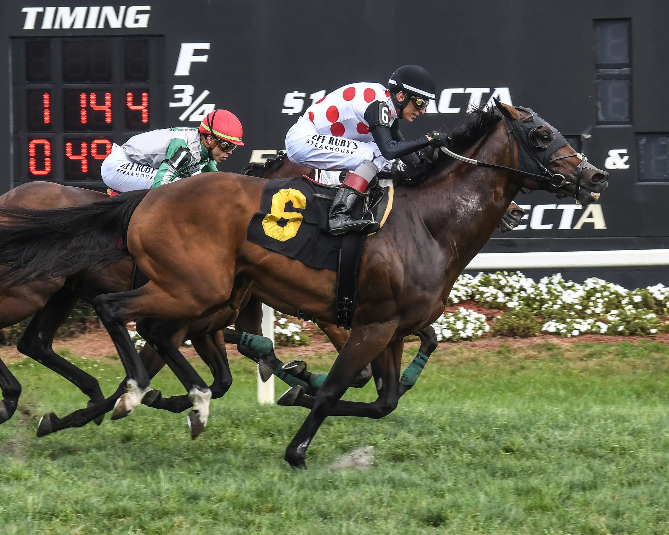 The Town, the even-money favorite trained by two-time Eclipse Award winner Brad Cox, was never a factor in the outcome and finished 6th. The order or finish behind the top three was Chicken Dance, Megacles, The Town, Cruisin Chuck, Move Jesse Move, and Mr. First. Mr Mo’s Magic paid $28.20.